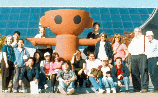 The tour group gathers at Toyo, the mascot for the Yoju Ceramics Museum |