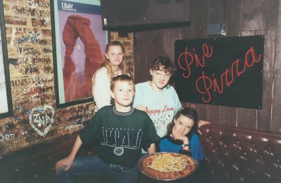 The kids at The Pie Pizza restaurant near the University of Utah. This was the only place you could get a pizza with smoked oysters on it. The taste and texture were out of this world, but, my goodness, it had a lot of oil in it! |