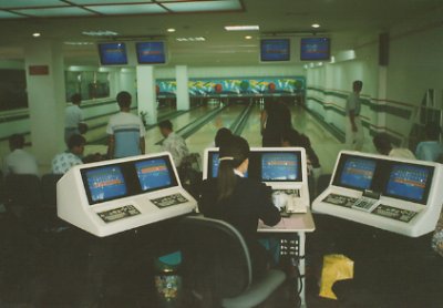 A high-tech bowling alley on the top floor of a department store in Suwon, Korea. This particular building was ill-starred. It was built in 1994, or so, but the businesses in it rarely prospered, and it finally caught fire. But as of 2004, it was still standing. |