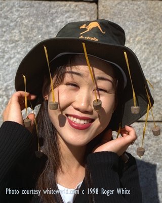 Another shot from that photo session: Asia meets Australia. The corks on the hat are there to ward off flies. In parts of Australia's Outback there grows a fly that just loves faces, hence the hat. |