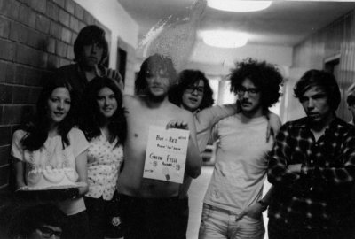 And here we have some of those same people way back when in 1973! Left to right: Beth Holmke, Art Kort, Valery Flugenhiemer, Roger White, Andy Celentano, Phil Mandel, and Jim Rutt. This was my Birthday party, and after getting tossed in the shower I was being given the "Green Fish" Award because I'd had such a losing streak on the game I introduced.