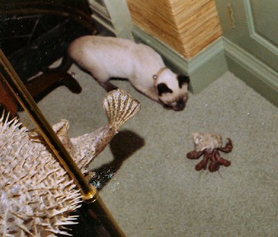 A big Hermit Crab being tailed by a curious kitten, and watched over by a stuffed Hawaiian blow fish. (1965) |