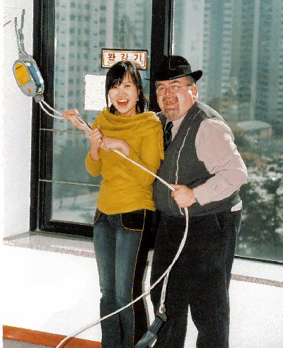 Get a Grip!Warren and Cathy check out the Emergency Rappeling Rope in the corridor outside the school that one can use (in theory) as a fire escape. |