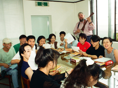 This is an adult class in one of the classrooms. We would learn lots of styles of English, including songs. I would get out my trusty banjo and we would sing folk songs. |