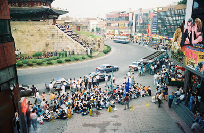 A protest on Namoon Square. This is right in front of the school. On the gate itself are police, making sure things stay orderly. |