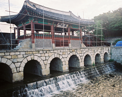 One of the picturesque parts of the famous city walls. This is the bridge over the river that runs through Suwon. |