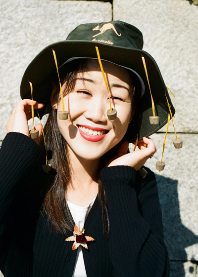 Mixing Korea and Australia. The lady was a student of mine in Korea. The hat comes from Australia. The dangling corks are designed to fend off pesky flies. |