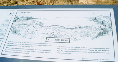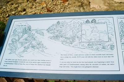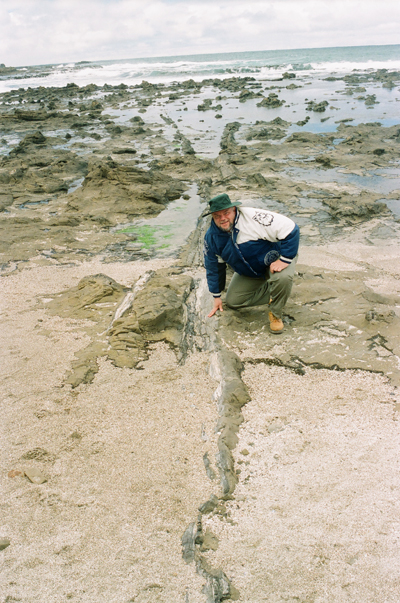 Curio Bay is notable because it is one of the few areas in New Zealand that has fossils. I am next to a petrified log in a petrified forest. This has helped in understanding how New Zealand has migrated over the last millions of years. |