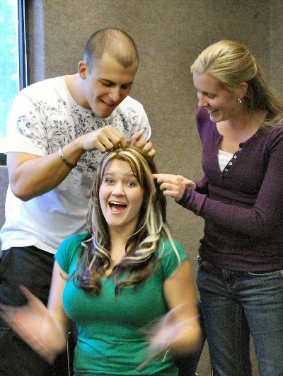 Daniel and Amy take a close look at ___'s new hair... er, hairdo! |