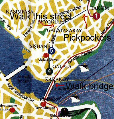 It took me about five seconds to realize that I'd seen this take place in the movie, "Harry Never Holds" (James Coburn, Michael Sarrazin, about pickpockets). I was being distracted. (My companion, Gurkan, was saying something similar.) In another ten seconds I had determined that my passport was gone from my left pocket!